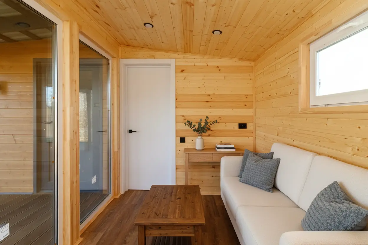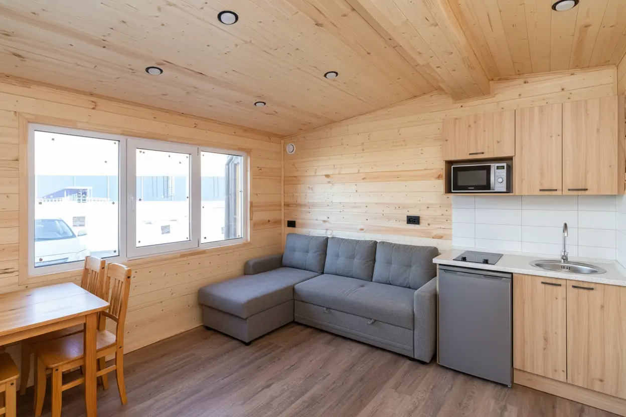 - Напольное покрытие жилой части: ОСБ 22 + spc ламинат «Дуб Париж»